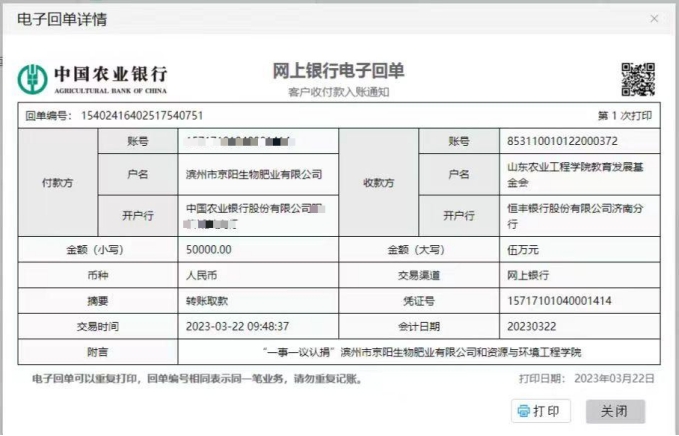 2023年4月,437ccm必赢国际官网将迎来70周年华诞,学校的繁荣发展离不开社会各界的热心关注和倾力帮助,3月22日,我院校企合作单位滨州京阳生物肥业有限公司为必赢70周年校庆认捐50000元。