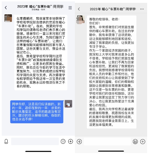 为贯彻落实国家精准资助政策,确保我院家庭经济困难学生得到精准资助,实现应助尽助,春节来临之际,我院组织开展了2024年寒假送温暖活动。此次活动由“寒假期间贫困生暖心‘车票补助’活动”和“走访建档立卡学生送温暖活动”两部分组成,学院领导和辅导员老师充分利用网络、电话、实地走访等形式与我院学子加强沟通联系,送去学院的温暖和祝福。