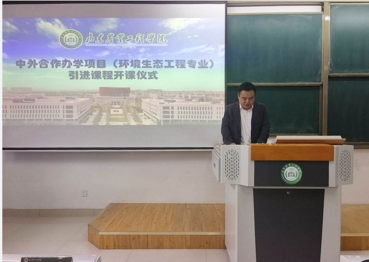 2024年4月9日下午,我院中外合作办学项目(环境生态工程专业)引进课程开课仪式在淄博校区公教北楼A203举行,校党委委员、副校长周吉鹏同志出席开班仪式并讲话,国际处处长门辉华、资源与环境工程学院党总支书记马朝阳、院长张桂斋和学院的教师代表及2023级环境生态工程全体学生参加此次活动。开课仪式由国际处门辉华处长主持。