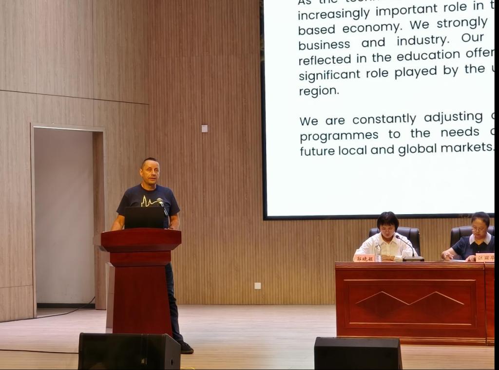 来自奥波莱技术大学的外籍教师Grzegorz Borsuk发言,他详细介绍了奥波莱技术大学的办学特色,特别是与我院环境生态工程专业的合作办学项目,他为新生们明确了中外合作专业的留学流程,讲解了国内外办学合作的情况,这为参与该项目的学生提供了宝贵的信息和指导。
