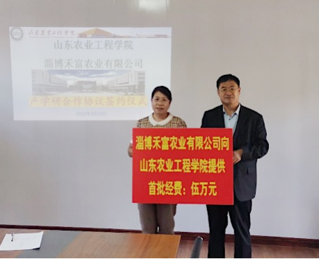 9月23日,我院与淄博禾富农业有限公司举行了产学研合作签约暨实践教学基地揭牌仪式,双方开启合作新篇章。校党委委员、副校长郑华美,学院院长苗峰,副院长张桂斋,科技处张连明及淄博禾富农业有限公司总经理洪晓青等参加本次活动。