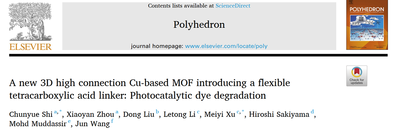 Chunyue Shi*, Xiaoyan Zhou, Dong Liu, Letong Li, Meiyi Xu, Hiroshi Sakiyama, Mohd Muddassir, Jun Wang,A new 3D high connection Cu-based MOF introducing a flexible tetracarboxylic acid linker: Photocatalytic dye degradation[J] Polyhedron 208 (2021) 115441.