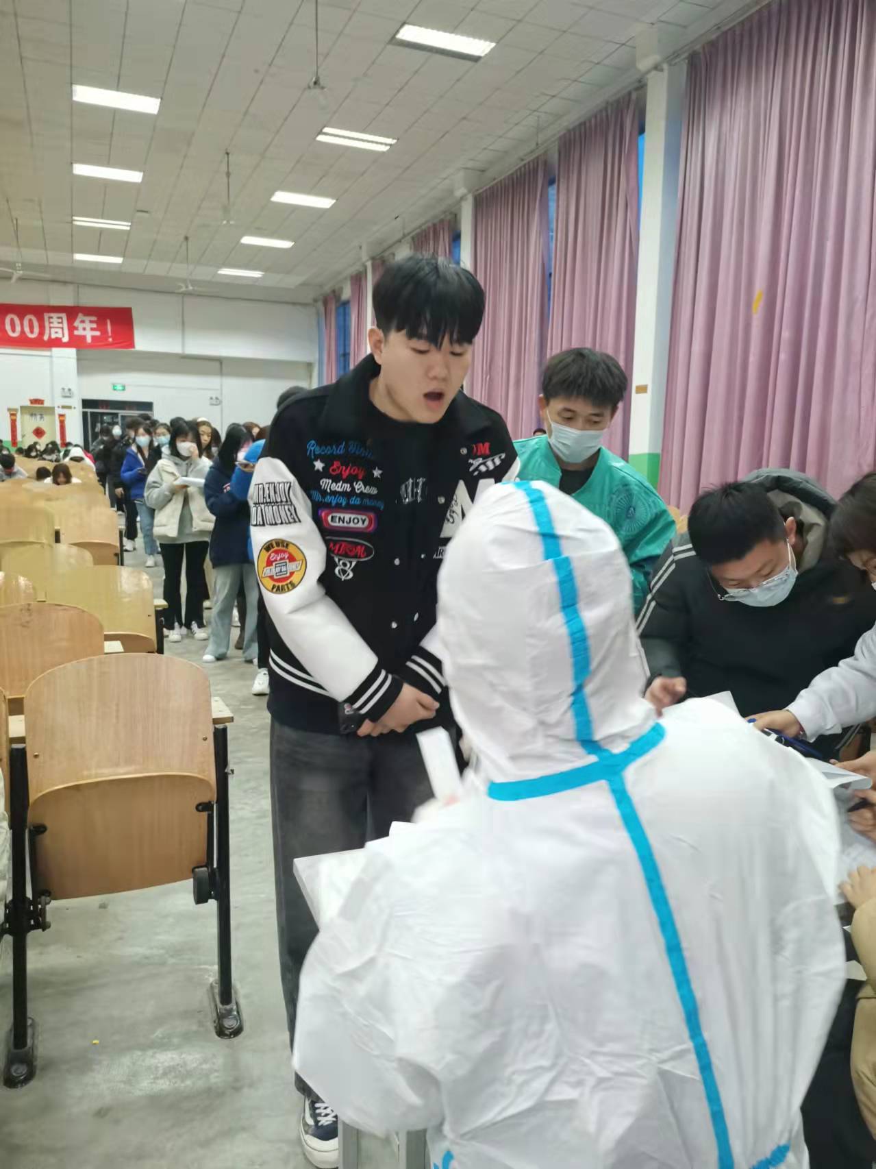 学校领导高度重视,到现场检查核酸检测工作情况,同学们听从指挥、积极配合,受检人员10人一组,整个核酸检测过程高效有序。