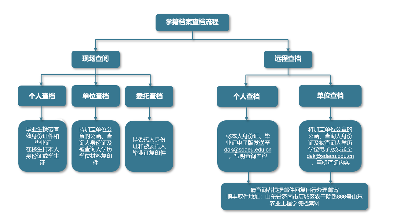 1.个人查档:将本人身份证、毕业证电子版发送至电子邮箱dak@sdaeu.edu.cn,在邮件中写明查询内容(录取新生名册、学籍表、成绩单),并注明联系电话。