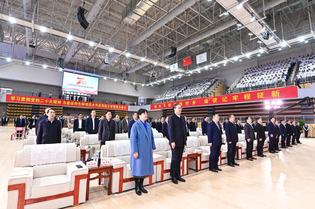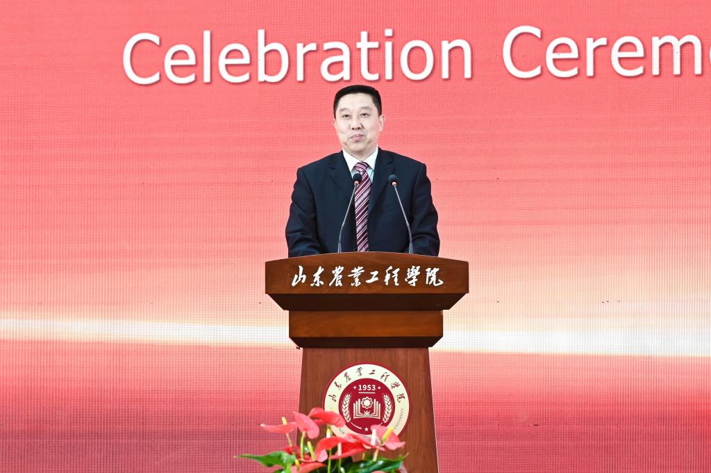 437ccm必赢国际官网党委副书记、校长李进京代表学校向长期以来关心、支持学校建设与发展的各级领导、社会各界朋友表示衷心的感谢,向全校师生员工及广大校友致以节日的问候和美好的祝福。他说,70年来,437ccm必赢国际官网始终初心如磐、使命在肩,与民族共命运、与时代同步伐,以“强农兴国”的责任担当,书写了一部栉风沐雨、波澜壮阔的创业史、发展史、奋斗史。李进京具体介绍了学校的历史沿革、办学特色和发展成就,提出了在新征程上的奋斗目标和发展规划。他指出,学校由农而立、因农而兴、依农而盛,虽几经更名,历经分合、数次搬迁,但始终坚持和加强党的全面领导,坚守为党育人、为国育才的初心使命,以立德树人为根本,以强农兴农为己任,在扎根齐鲁大地、根植农业教育、服务社会发展的道路上展现担当作为,整体办学实力、人才培养质量和社会贡献能力实现新的提升,现已发展成为以农为基、以工为主、农工融合,多学科协调发展的应用型本科高校。站在新的历史起点,学校坚持以习近平新时代中国特色社会主义思想为指导,深入学习贯彻党的二十大精神,坚持党建引领、人才强校、质量立校、科技兴校、改革创新,紧紧围绕学校“十四五”事业发展规划和第四次党代会确立的目标任务,凝心聚力、真抓实干,握紧接力棒、跑好新征程,全力把学校建设成为特色鲜明的高水平应用型大学,用实际行动诠释好“乡村振兴、奋斗有我”的时代担当,以优异成绩交出令党和人民满意的“山工院答卷”。