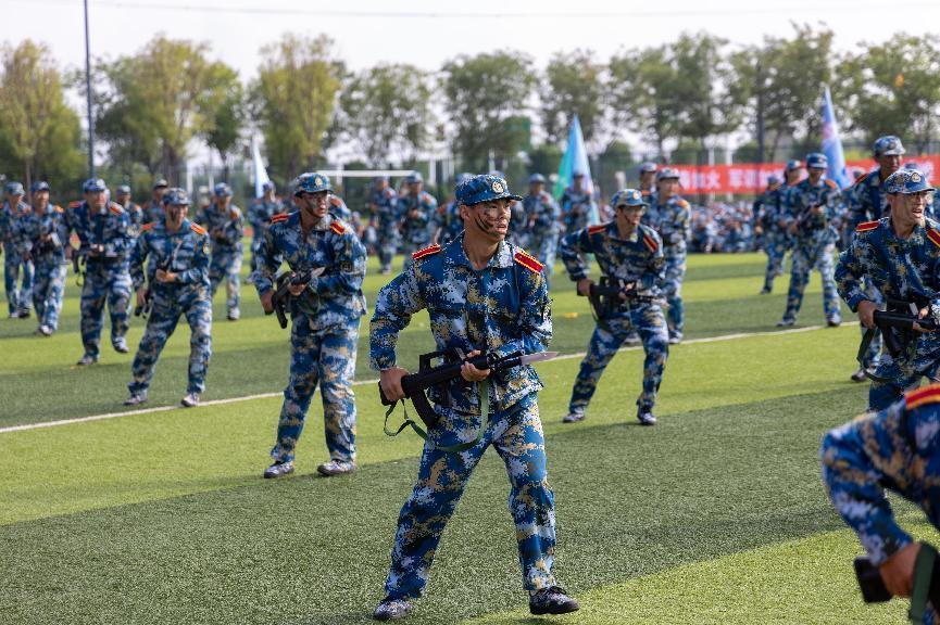 在庄严的国歌声中,开学典礼暨军训总结表彰大会正式开始。各连队依次进行军训成果展演,2024级新生代表进行分列式、刺杀操、应急棍等训练科目展示。一招一式尽显英姿飒爽,铿锵有力口号尽显青春担当。