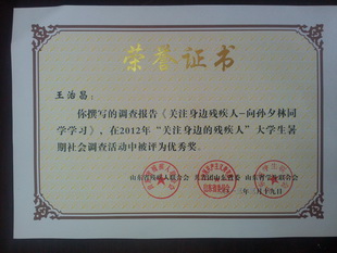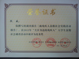 据悉,本次“关注身边的残疾人”2012年大学生暑期社会调查活动是由山东省残疾人联合会、共青团山东省委和山东省学生联合会联合开展,目的是倡导全省的广大青年全面了解我省残疾人的生产生活状况,切实掌握他们的实际困难和特殊需求,在日常的学习、生活和工作中更加关心关注残疾人事业。活动开展以来,我省的20余所高校的400余名大学生积极行动起来,深入残疾人家庭和工作一线,共撰写191篇高质量的调查报告,内容涵盖残疾人教育、就业、社会保障和生存质量等多方面内容,在社会上产生了巨大反响。