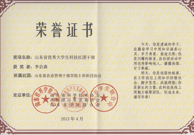 近日由山东省科学技术协会、共青团山东省委和山东省学生联合会共同举办的2013年山东省优秀大学生科技社团和山东省优秀大学生科技社团干部的评选活动落下帷幕,由我院推选的机械电子工程系的E科科技协会不负众望,在全省众多参评的科技社团中脱颖而出,被评为“山东省优秀大学生科技社团”,机械电子工程系学生李启森被授予“山东省优秀大学生科技社团干部”荣誉称号。