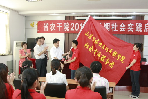 王院长作重要讲话。王院长首先代表院党委、院行政对合作企业表示感谢,并向积极参加暑期社会实践活动的教师和同学们表示亲切的问候。他指出,社会实践是大学生思想政治教育的重要环节,对于促进大学生了解社会、了解国情,增长才干、奉献社会,锻炼毅力、培养品格,增强社会责任感具有不可替代的作用。他要求同学们要虚心学习,在实践中熏陶思想、增长才干;要扎实工作,力求实效,用学到的知识为基层、为企业做一些实实在在的工作;要加强的纪律性,注意安全,注重活动的宣传和活动成果的深化,圆满完成实践任务。随后,王院长为社会实践服务团队授旗。