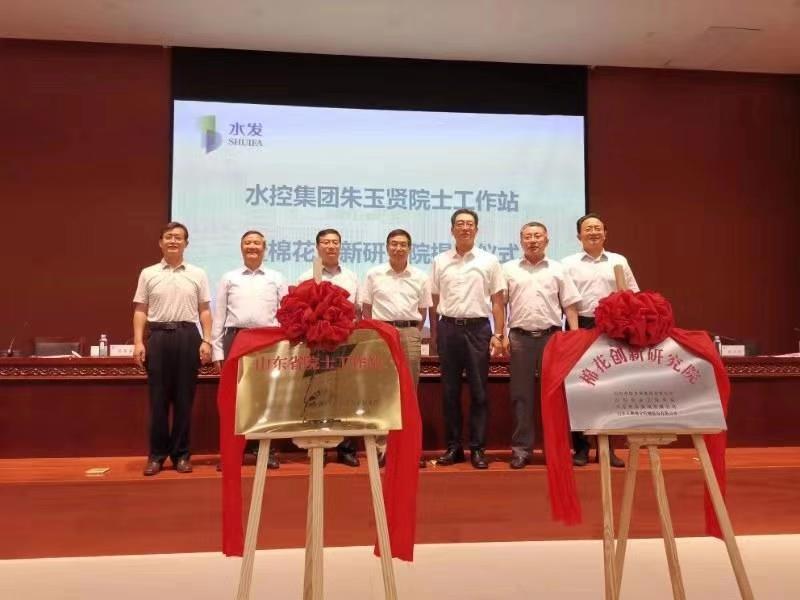 朱玉贤、潘军、王西奎、刘肖军、吴振东、刘琦共同为院士工作站和棉花创新研究院揭牌。