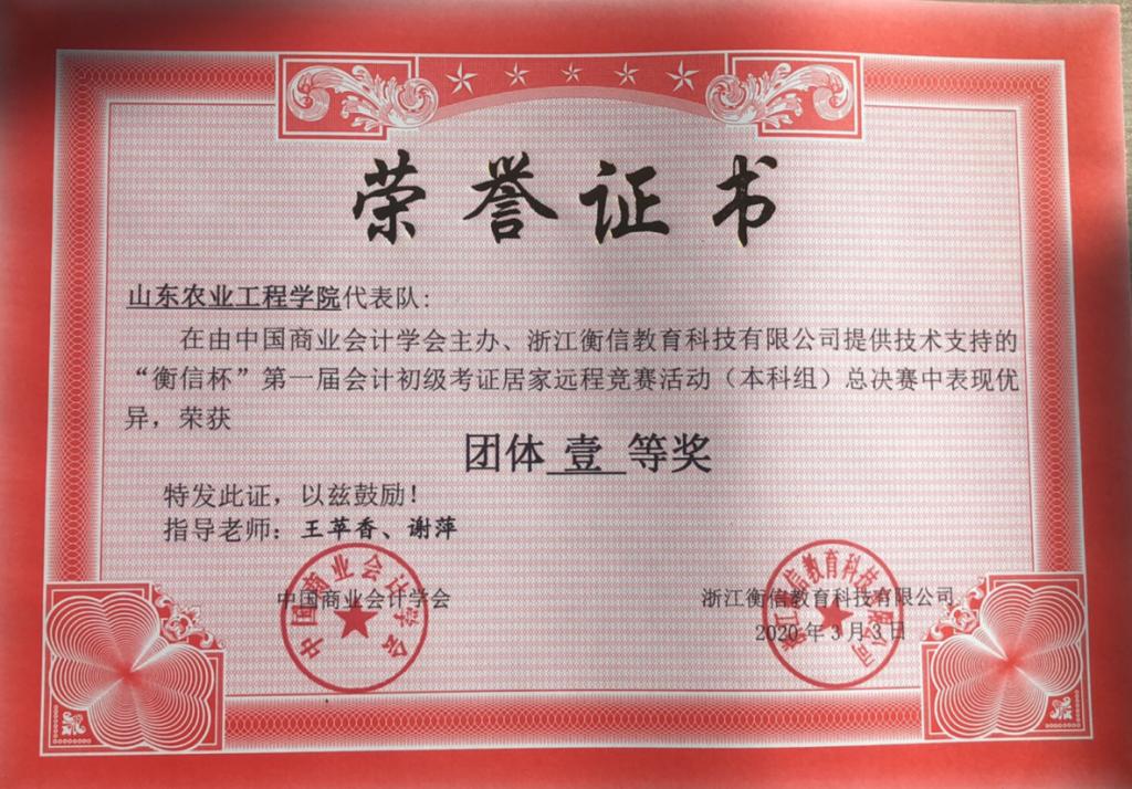 近日,商学院组织200多名学生参加了“百城千校万人、星火燎原”会计初级考证线上竞赛,获得全国总决赛第三名(团体一等奖)的优异成绩,其中王雪、郭天禹2位同学的个人成绩在此次竞赛中排名全国前十位。该竞赛由中国商业会计学会主办,全国116所高校、2万多人参加。商学院王苹香、谢萍老师参加线上指导,黄河、杨甜甜、蒋杰锐老师线上组织管理,教师悉心指导,细致沟通,耐心答疑,激发参赛同学学习兴趣,为取得优异竞赛成绩发挥积极作用。