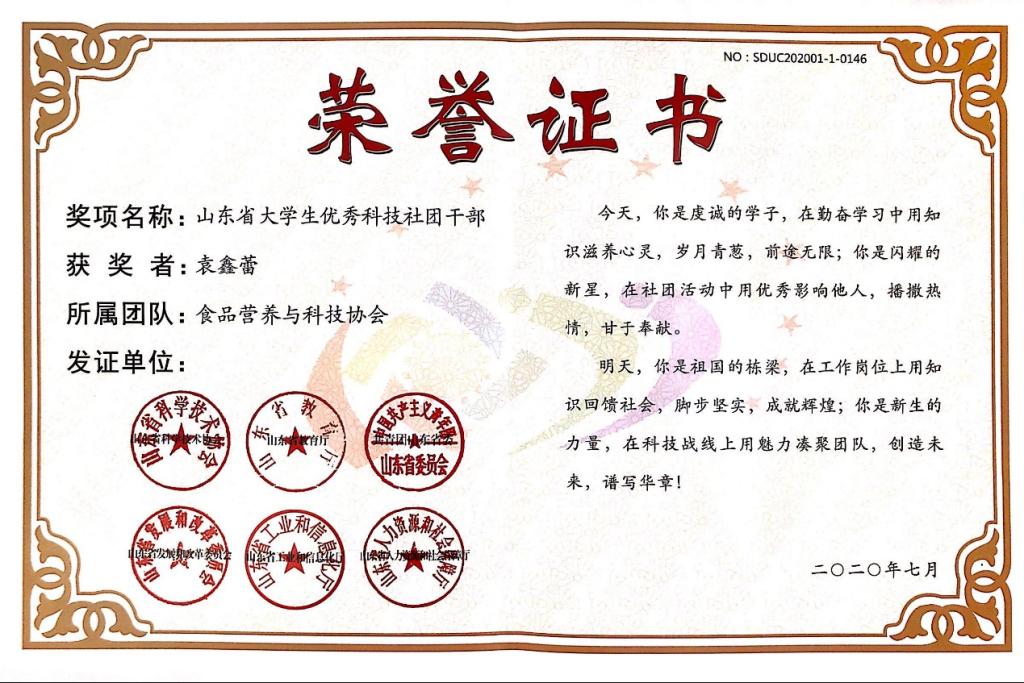 近日,由省科协、省教育厅、团省委、省发展改革委、省工业和信息化厅、省人力资源社会保障厅共同开展的2020年山东省大学生优秀科技社团和优秀科技社团干部评选活动落幕,经过选拔、推荐和严格评审,必赢食品营养与科技协会被评为“2020年山东省大学生优秀科技社团”,食品营养与科技协会副社长袁鑫蕾和工程创新社团负责人乔大壮荣获“2020年山东省大学生优秀科技社团干部”荣誉称号。