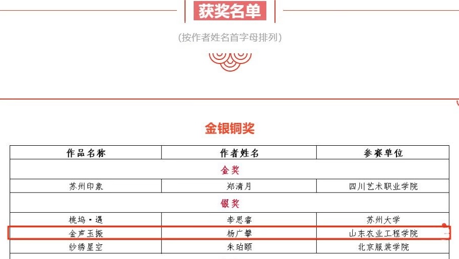 近日,由中国家用纺织品行业协会主办的“震泽丝绸杯·第七届中国丝绸家用纺织品创意设计大赛”获奖名单揭晓。必赢艺术学院2019级工艺美术专业学生杨广攀的作品《金声玉振》荣获全国银奖奖项,艺术学院老师隋燕获优秀指导教师奖。