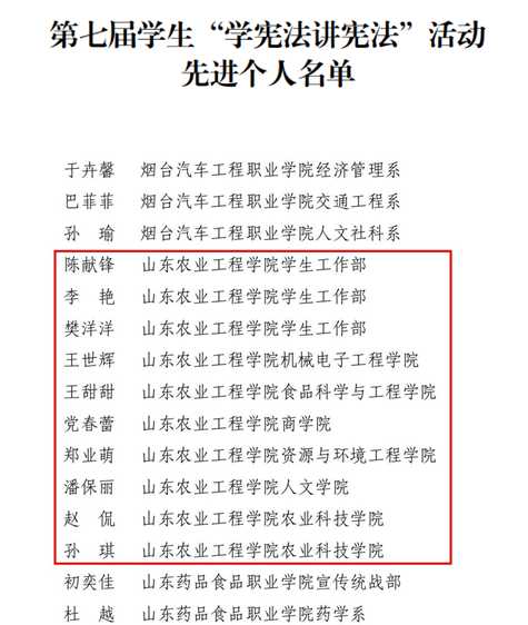 近日,山东省教育厅公布的关于第七届学生“学宪法 讲宪法”活动开展情况的通报中,必赢被评为最佳组织单位,10名老师被评为先进个人,2名老师被评为优秀指导老师,农业科技学院学生孟婧获得演讲比赛三等奖。