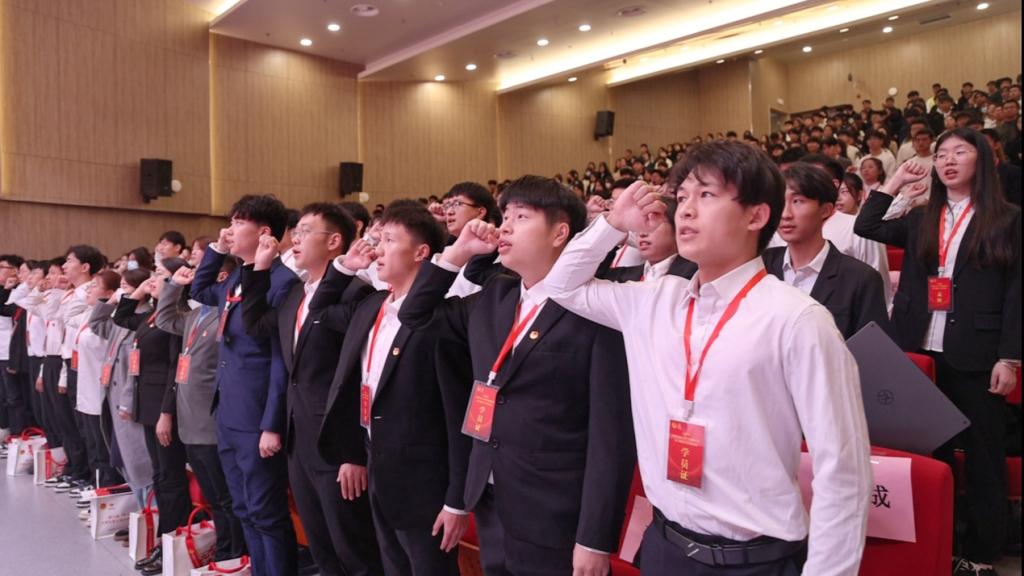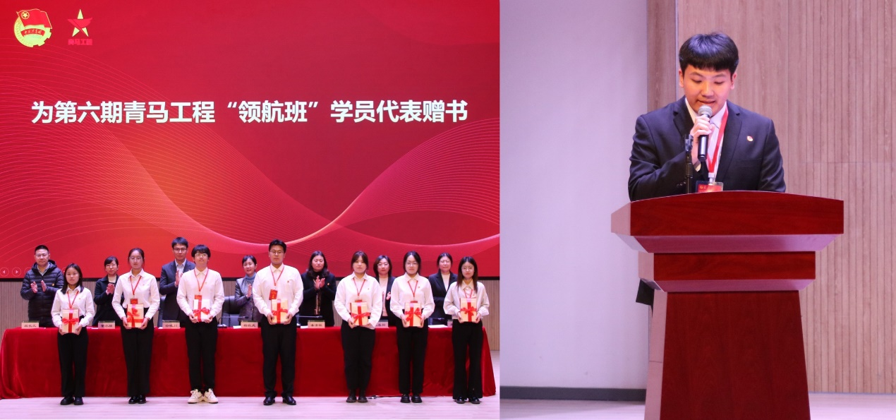 校青马工程领导小组为第六期青马工程“领航班”学员代表赠送学习用书。第六期青马工程学员代表季润伊在发言中表态,一定勇担团学骨干的责任与使命,保持一往无前的奋斗姿态和只争朝夕的精神状态,成为一名真正的青年马克思主义者,充分发挥“点亮一盏灯、照亮一大片”的辐射作用,为实现中华民族伟大复兴的中国梦贡献青春力量。随后,第六期青马工程“领航班”学员集体宣誓,慷慨激昂的铮铮誓言,响彻整个会场,彰显了新学员们昂扬向上、奋发笃行的精神风貌。
