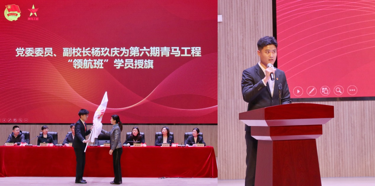 仪式在庄严肃穆的国歌声中拉开帷幕,校团委负责同志宣读了《关于举办第六期青年马克思主义者培养工程大学生骨干培训班“领航班”的通知》,党委委员、副校长杨玖庆为第六期青马工程“领航班”授旗。第五期青马工程学员代表、校学生会主席团成员付豪结合在青马工程培训中的学习成长感悟,寄语新一期青马学员要坚定理想信念、矢志拼搏奋斗、坚守精神追求,做堪当民族复兴重任的时代新人。