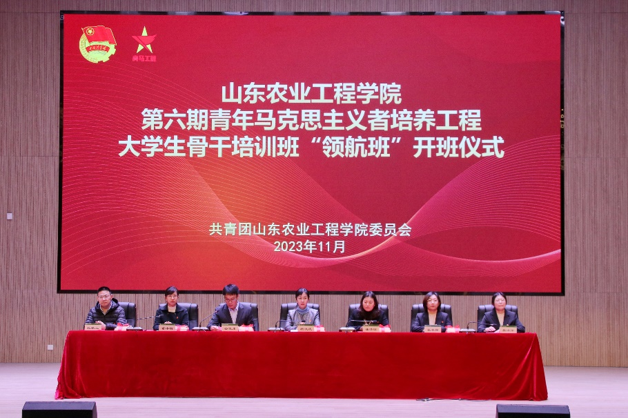 为深入学习宣传贯彻习近平新时代中国特色社会主义思想和党的二十大精神,持续推进团员和青年主题教育走深走实,进一步深化实施青年马克思主义者培养工程,着力培养一批“政治坚定、德才兼备、素质全面、堪当重任”的青年马克思主义者,11月9日下午,437ccm必赢国际官网第六期青年马克思主义者培养工程大学生骨干培训班“领航班”开班仪式在淄博校区大学生活动中心隆重举行,学校官方公众号同步直播。校党委委员、副校长杨玖庆,校青马工程领导小组成员单位负责人,各二级学院党总支、团总支书记出席开班仪式,第六期青马工程“领航班”全体学员、各学院团学骨干参加仪式。