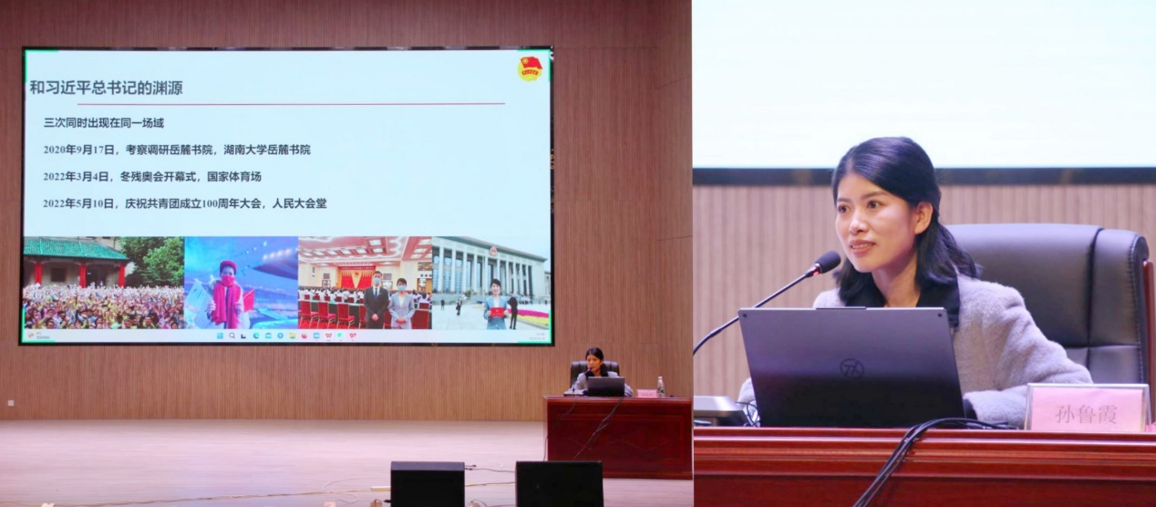 宣讲现场,共青团中央“青春心向党 奋进新征程”示范宣讲团成员、湖南大学思想政治辅导员、湖南省中国特色社会主义理论体系研究中心特约研究员、中国青少年研究会会员孙鲁霞以“把牢新时代党的青年工作的重要思想”为主题,围绕习近平总书记关于青年工作的重要思想,从“表述从何而来”“汲取思想伟力”“寄语时代新人”三个方面出发,用深入浅出的语言,为在场师生阐明了习近平总书记关于青年工作重要思想的理论来源、具体内涵和实践路径。面对复杂多变的国际形势,孙鲁霞老师号召青年学子要立大志、明大德、成大才、担大任,做无愧于时代和人民的新时代好青年。