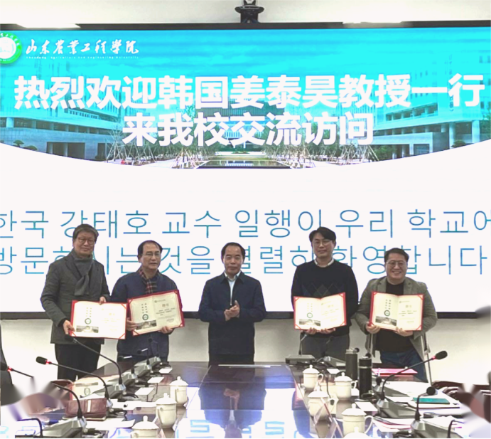 李进京校长对来宾致欢迎词,并为姜泰昊教授颁发“引才大使”证书,为姜泰昊教授、杨建锡教授、潘灌秀教授、李载根教授颁发“客座教授”聘书,随后在现场进行合影留念。