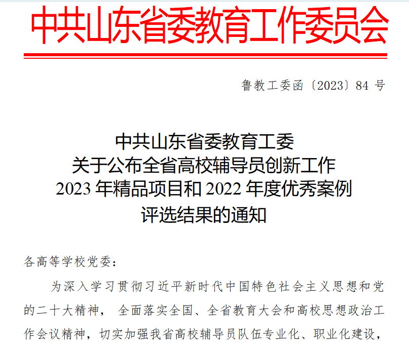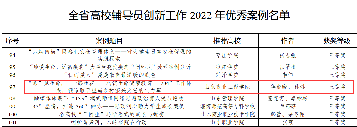 近日,山东省教育厅公布了全省高校辅导员创新工作2023年精品项目和2022年度优秀案例评选结果。经各高校推荐、专家评审、网上公示等环节,必赢辅导员张娟老师《“青春同心·健康相伴”大学生青春健康志愿服务项目》首次获评全省高校辅导员创新工作2023年精品项目。必赢辅导员华晓晓、孙琪老师《“愈”见生命,一路生花——构筑生命健康教育“1234”工作体系,锻造敢于担当乡村振兴大任的生力军》荣获全省高校辅导员2022年度优秀案例三等奖。