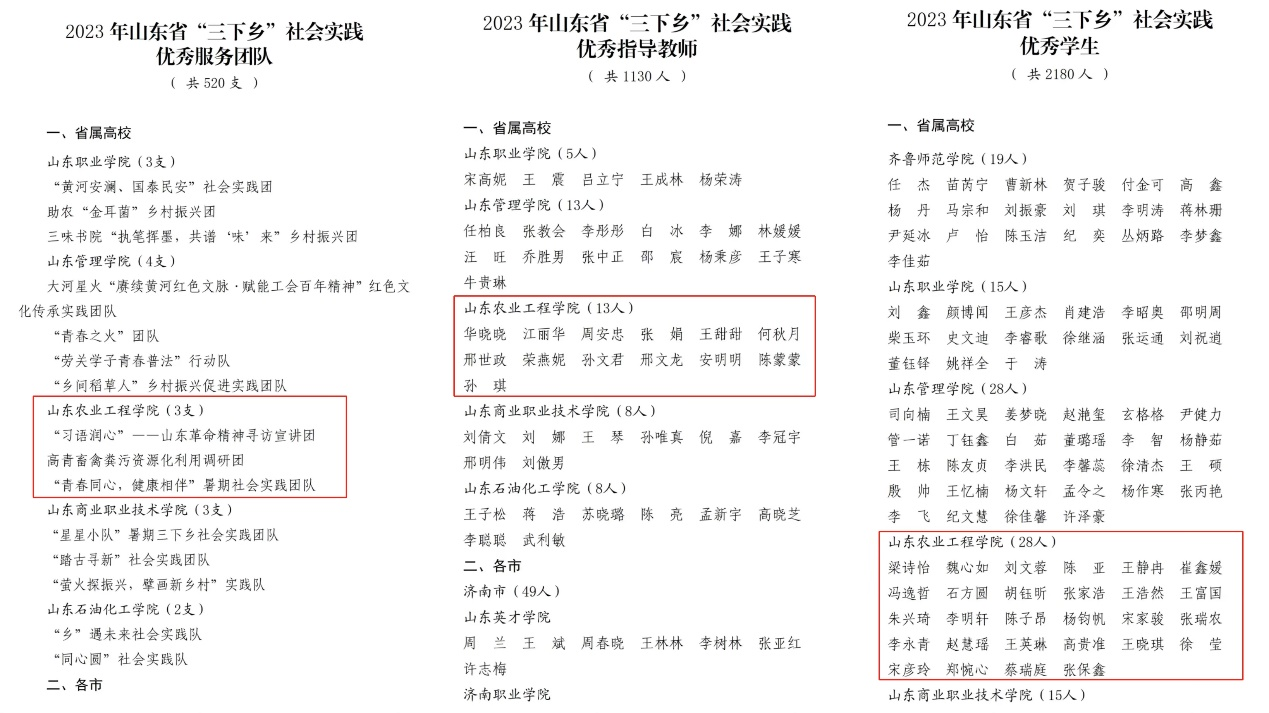 近期,团省委公布2023年暑期“三下乡”社会实践获奖名单,必赢1个团总支、1个社会实践项目、3个社会实践团队、13名指导教师和28名学生获得表彰。其中,农业科技学院团总支荣获山东省“三下乡”社会实践优秀组织单位称号;食品科学与工程学院“膳待老人”——山东省老年人慢性病排查与健康科普志愿服务项目获山东省“三下乡”社会实践优秀服务基层实践项目;农业科技学院“习语润心”——山东革命精神寻访宣讲团、资源与环境工程学院高清畜禽粪污资源化利用调研团、经济管理学院“青春同心,健康相伴”暑期社会实践团队获山东省“三下乡”社会实践优秀服务团队称号;华晓晓等13名教师获山东省“三下乡”社会实践优秀指导教师称号;梁诗怡等28名学生获山东省“三下乡”社会实践优秀学生称号。