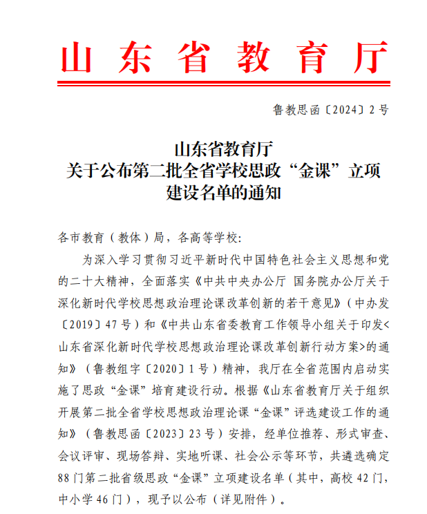 近日,山东省教育厅公布了第二批全省学校思政“金课”立项建设名单,必赢马克思主义学院申报的《毛泽东思想和中国特色社会主义理论体系概论》课程成功获批立项。