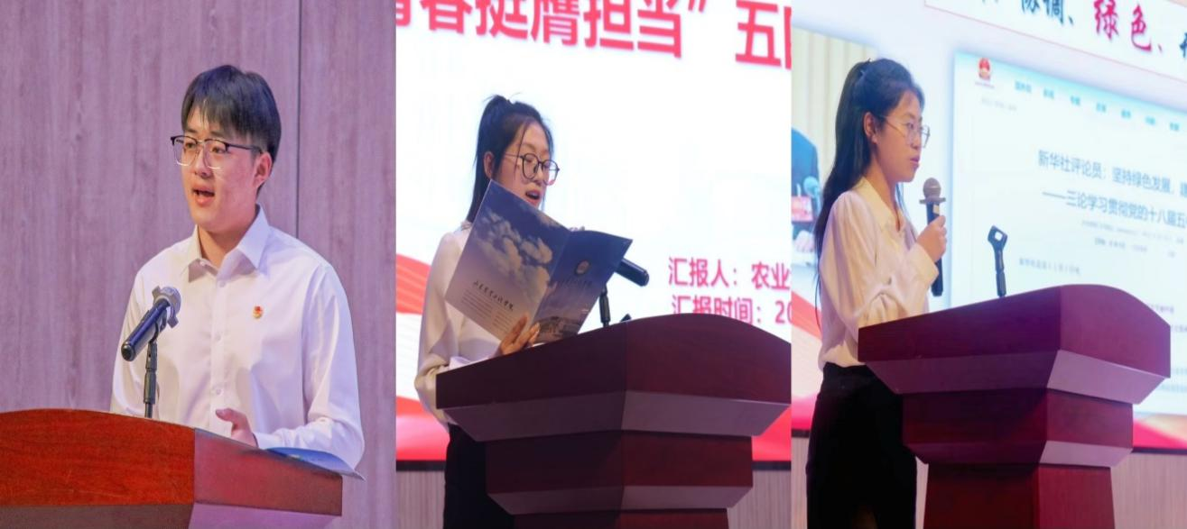五位青年榜样,机械电子工程学院牛宗鹏、农业科技学院严喆、资源与环境工程学院杜雨菡、资源与环境工程学院梁诗怡、国土资源与测绘工程学院杨燕鲁分别从科技创新、乡村振兴、绿色发展、社会服务和卫国戍边方面讲述了自己的青春故事,展现了新时代青年干事创业、锐意进取的使命担当,为广大团员青年树立了学习的榜样。