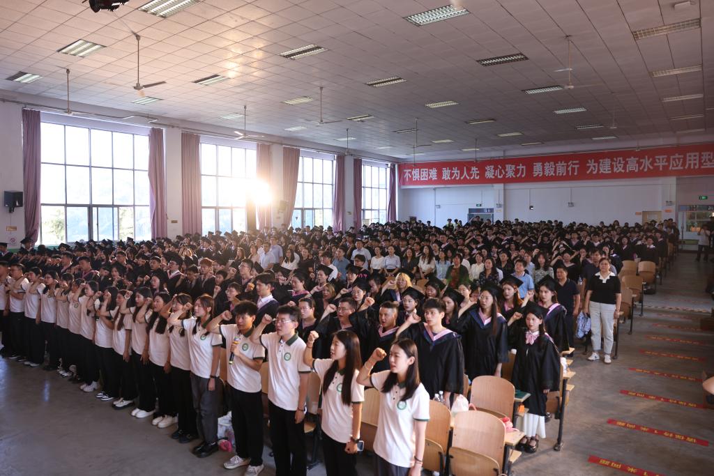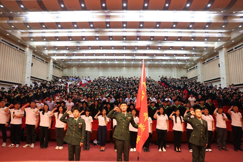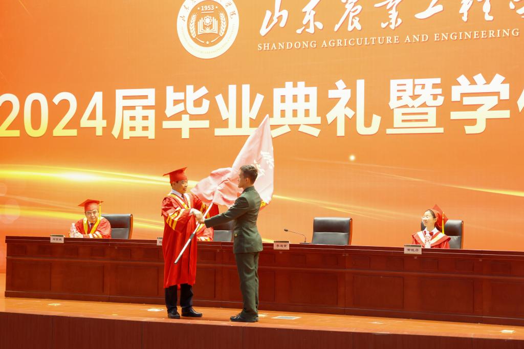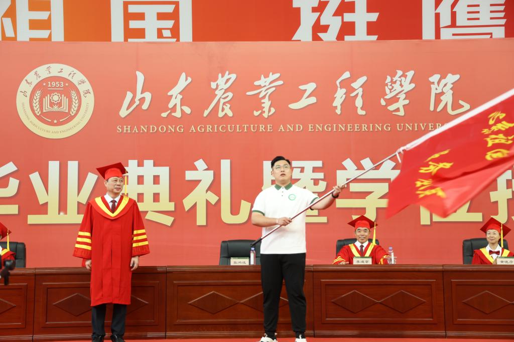 典礼上,还举行了职业生涯启航暨基层就业毕业生出征仪式。张鸿波、李进京分别为三校区基层就业毕业生队伍授旗。基层就业毕业生代表带领大家进行集体宣誓。“不负国家期许和社会期望,求实创新、笃行不怠,踔厉奋发、勇毅前行……”铿锵有力的誓言彰显了山农工学子热爱祖国、心系基层、勇担使命、奋发有为的优秀品质。