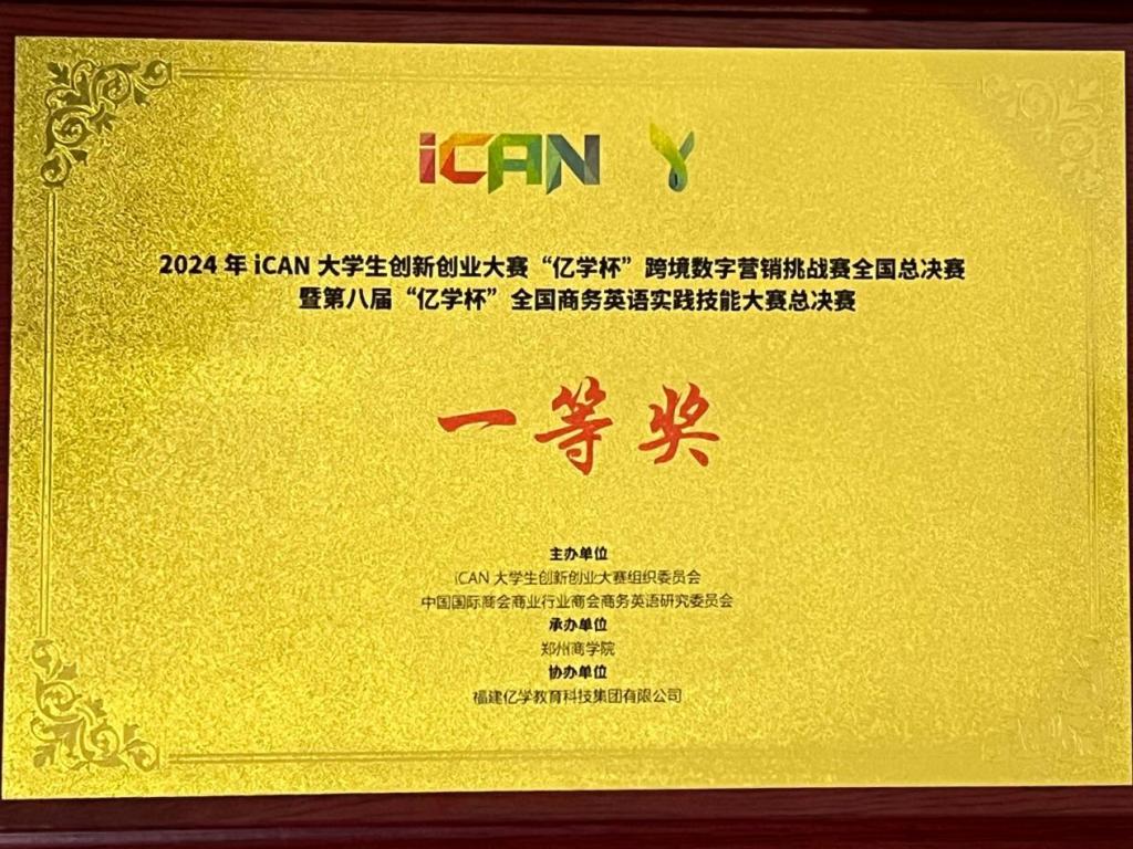 11月16日,2024年iCAN大学生创新创业大赛“亿学杯”跨境数字营销挑战赛全国总决赛暨第八届“亿学杯”全国商务英语实践技能大赛总决赛在郑州商学院落下帷幕,由必赢人文学院王洁成、吕亚男老师指导的spotlight团队在全国总决赛31支参赛队伍中脱颖而出,荣获全国一等奖。