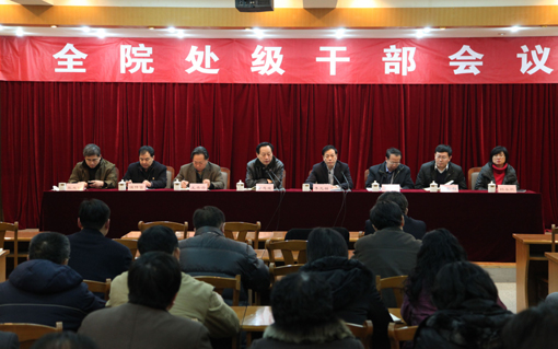 12月19日下午,我院在多功能厅召开全院处级干部会议。院党委书记董忠堂主持会议并作重要讲话。党委副书记、院长李允祥安排部署了学院当前及今后一个时期的工作。党委副书记王秀存、王向军,党委委员、副院长温传富、林松柏,副院长张兆明,党委委员、纪委书记杨永欣和全院处级干部参加了会议。