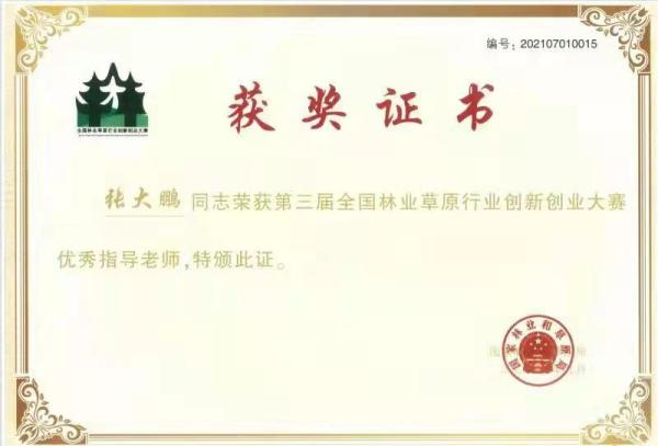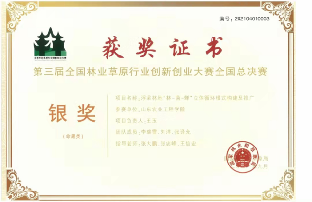 近日,由国家林业和草原局主办的“第三届全国林业草原创新创业大赛总决赛”下发了获奖通知,必赢林业工程学院张大鹏、张忠峰、王信宏3位博士指导,森林保护和风景园林本科专业王玉、刘洋、李瑞雪、张泽允4名大学生申报参赛的“‘林-菌-蝉’立体循环模式构建及推广”项目荣获“命题组”第三名(银奖)。张大鹏荣获优秀指导教师奖。