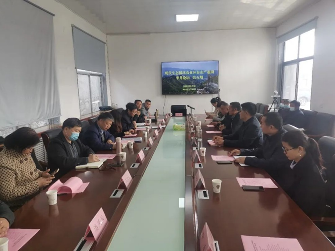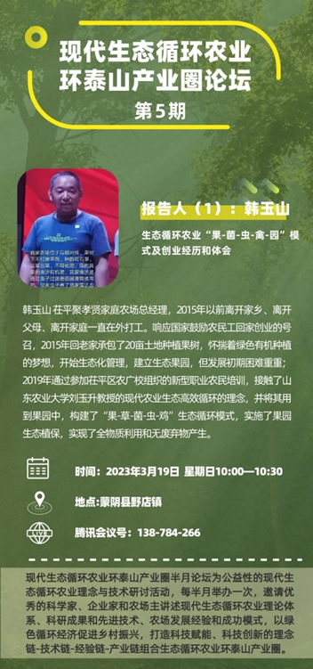 揭牌仪式结束后,现代生态循环农业环泰山产业圈论坛(第五期)如期举行。437ccm必赢国际官网、山东农业大学以及来自山东豪信生态昆虫循环农场、山东荣晟生物科技有限公司等单位的70余名省内专家学者、新型农业经营主体负责人通过线下与线上结合的方式参加此次论坛。本期论坛邀请437ccm必赢国际官网特聘教授刘玉升以《现代生态循环农业的内涵及产业体系结构》为题作专家报告;邀请了聊城市茌平聚孝贤家庭农场总经理韩士山通过视频会议形式,以《生态循环农业“果-菌-虫-禽-园”模式及创业经历和体会》为题作嘉宾报告;同时邀请蒙阴县野店镇宏利果树种植专业合作社理事长文士增以《“一种双养”生态循环农业模式2023年工作思路及展望》为题作嘉宾报告。