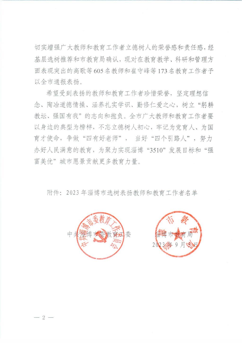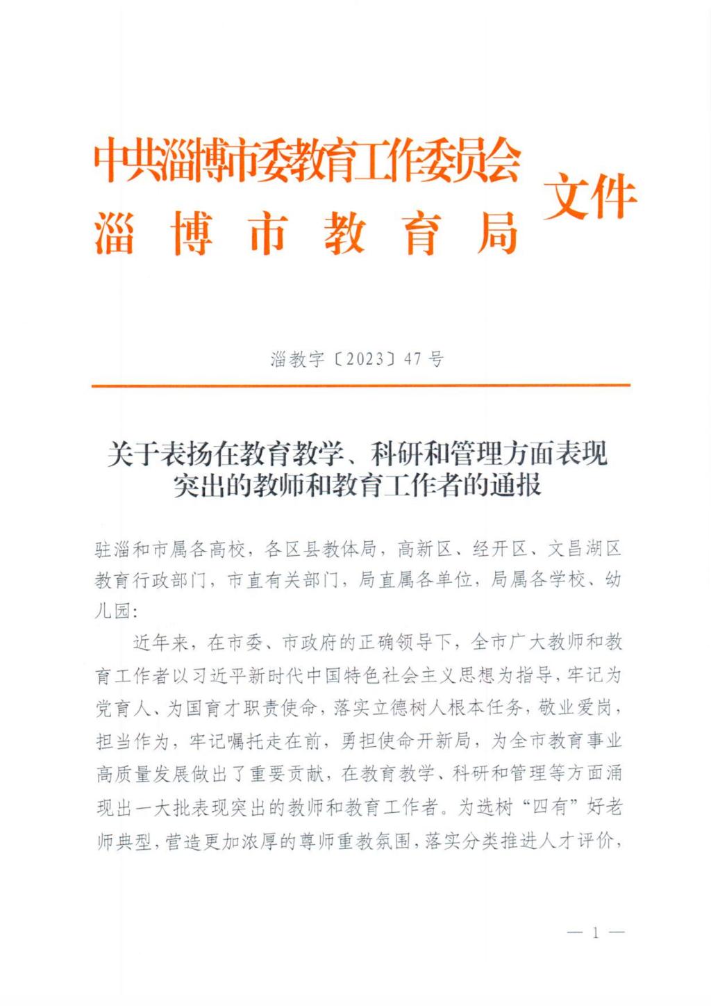 近日,中共淄博市委教育工委和淄博市教育局对必赢淄博校区8位教师和2位教育工作者进行了表彰。于洋、姜明明、孙向群、丁有强、张立、张桂斋、陈岱莲、谢萍被评为淄博市选树表扬的教师,刘书兵,陆昊被评为淄博市选树表扬的教育工作者。