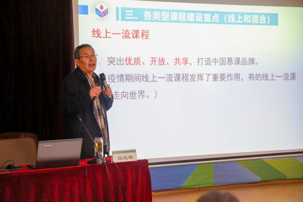 马池珠教授以“一流课程建设与申报”为主题,细致讲解了第三批一流课程申报的课程推荐范围、各类型课程推荐计划及课程申报重点,重点分析了混合式一流课程建设的思路与方法、教学模式的三个阶段及对应的实施细则、配套资源开发的类型及内容、混合式一流课程评价方式及注意事项,并给出了相应的课程示例。马池珠教授结合具体案例深入解读了混合式一流课程申请具体流程、相应评价指标以及申报书撰写要点,并且对青年教师提出的一流课程申报相关问题进行了详细解答,为新入职青年教师后续申报一流课程指明了方向。