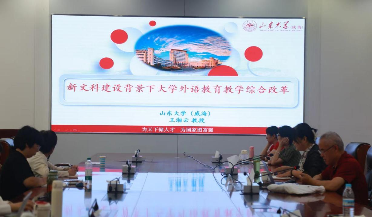 王湘云教授从问题出发,聚焦国家战略需求、教育部工作重点以及新时代学生需求等,阐述了外语教育教学改革的必要性,从改革背景、主要内容、创新之处三个方面详细解读了外语教育教学改革的路径,精准分析了相关政策,为外语教育教学改革提供了针对性的指导。他还分享了山东大学(威海)外语教育教学改革思路和主要举措,介绍了山东大学(威海)外语教学的创新之处。王湘云教授的报告既有理论的分析,又有实践操作的指导,有高度有广度有深度。与会教师表示受益匪浅,将不断探索新的教学理念和教学方法,深入推进教育教学改革,推动学院高质量发展。