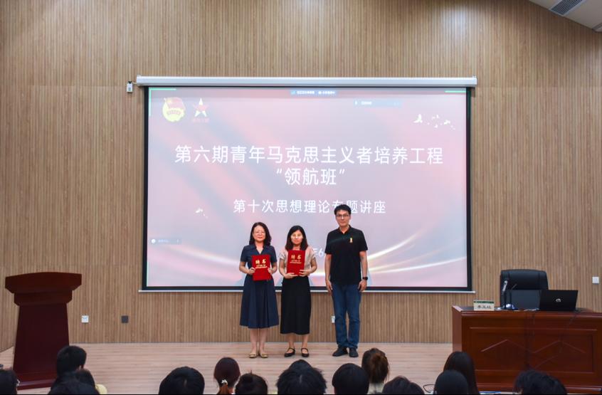 讲座开始前,校团委主要负责同志为青马工程“领航班”导师团成员田芸、李玉红两位老师颁发聘书。