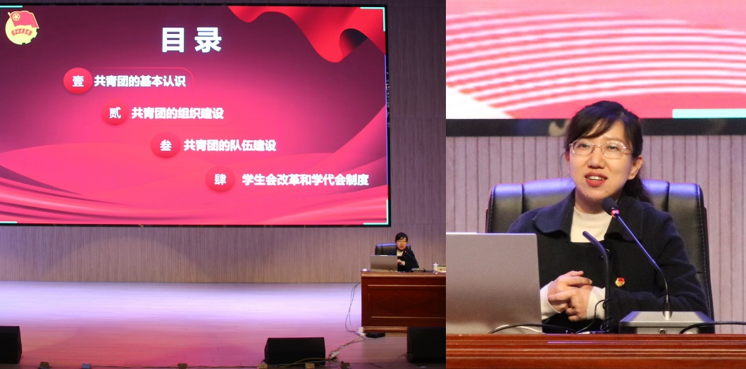 本次培训特邀山东理工大学团委书记王振作题为《贯彻落实习近平总书记关于青年工作的重要思想,奋力开创学校共青团事业高质量发展新局面》的专题报告。王振围绕“七个明确”系统阐述了习近平总书记关于青年工作的重要思想,并分享了山东理工大学共青团工作的系统规划和特色亮点,为开创学校共青团事业新局面提供了思路和指引。随后,陈大量老师针对三会两制一课、主题团日、团员发展等团务基础知识进行了全面详细的讲解,强调了团干部熟练掌握团务工作基本知识和方法的重要性。最后,校团委副书记董小靖从共青团职能定位、组织建设、队伍建设和学生会改革四个方面阐述新时代共青团工作的主要任务和组织工作开展方法等内容。