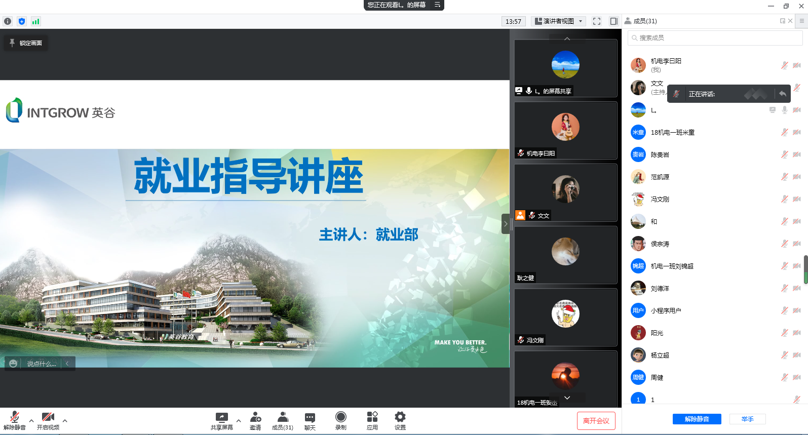 青岛英谷教育科技股份有限公司是一家现代产教融合型企业,多年从事教育产业,与潍柴动力、歌尔声学、青岛海信、玲珑轮胎等企业联系密切。杨老师收介绍了2022届毕业生的就业形势,详细阐述了就业选择、职业决策的不确定性、就业焦虑等就业规划,其次介绍了常用的招聘网站、分析了机械类专业主要就业岗位、分享了如何调节就业中的负面情绪,最后讲解了劳动合同签订常见问题、个人档案的取向,分享了职场中的相处之道。