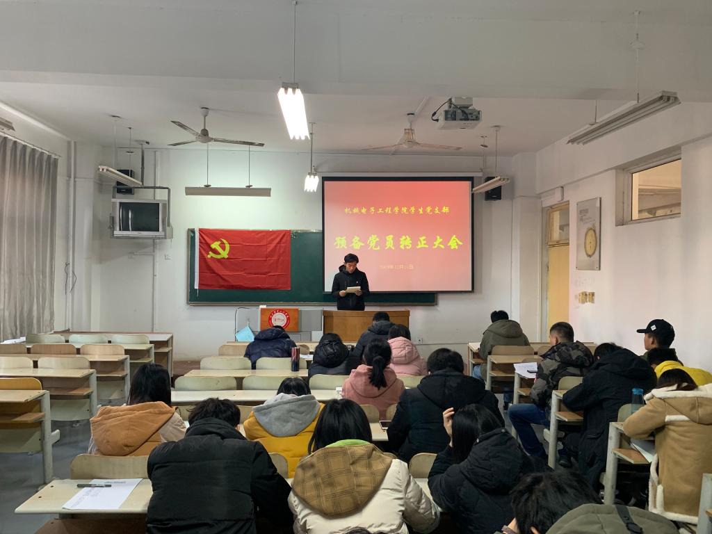 2019年12月11日,机械电子工程学院学生党支部于北校区2号教学楼215教室召开了2019年下半年预备党员转正大会。大会由学生党支部书记郑业萌主持,学生党支部全体党员及16名拟转正预备党员参加了大会。