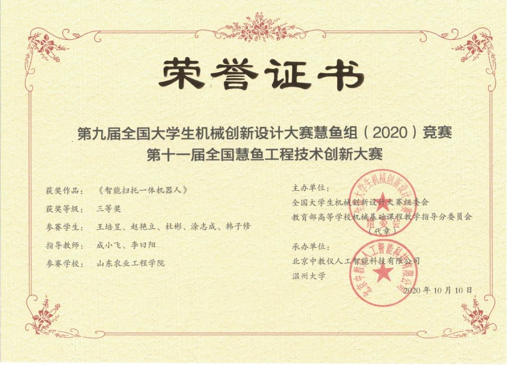 近日,由全国大学生机械创新大赛委员组、教育部高等学校机械基础课程教学指导委员会主办,温州大学承办的第九届全国大学生机械创新设计大赛慧鱼组竞赛在温州大学落下帷幕。我院选送的两件作品全部获得国家级三等奖,实现了我院在这项赛事奖项上从无到有的突破。