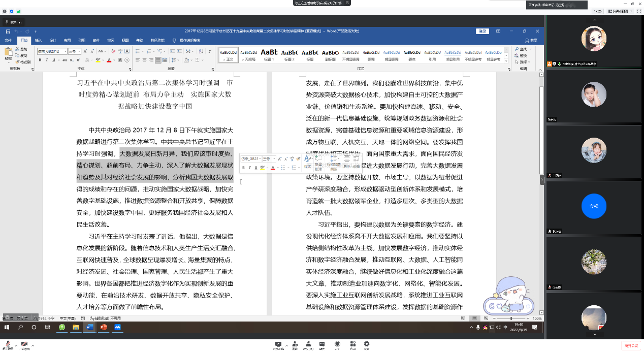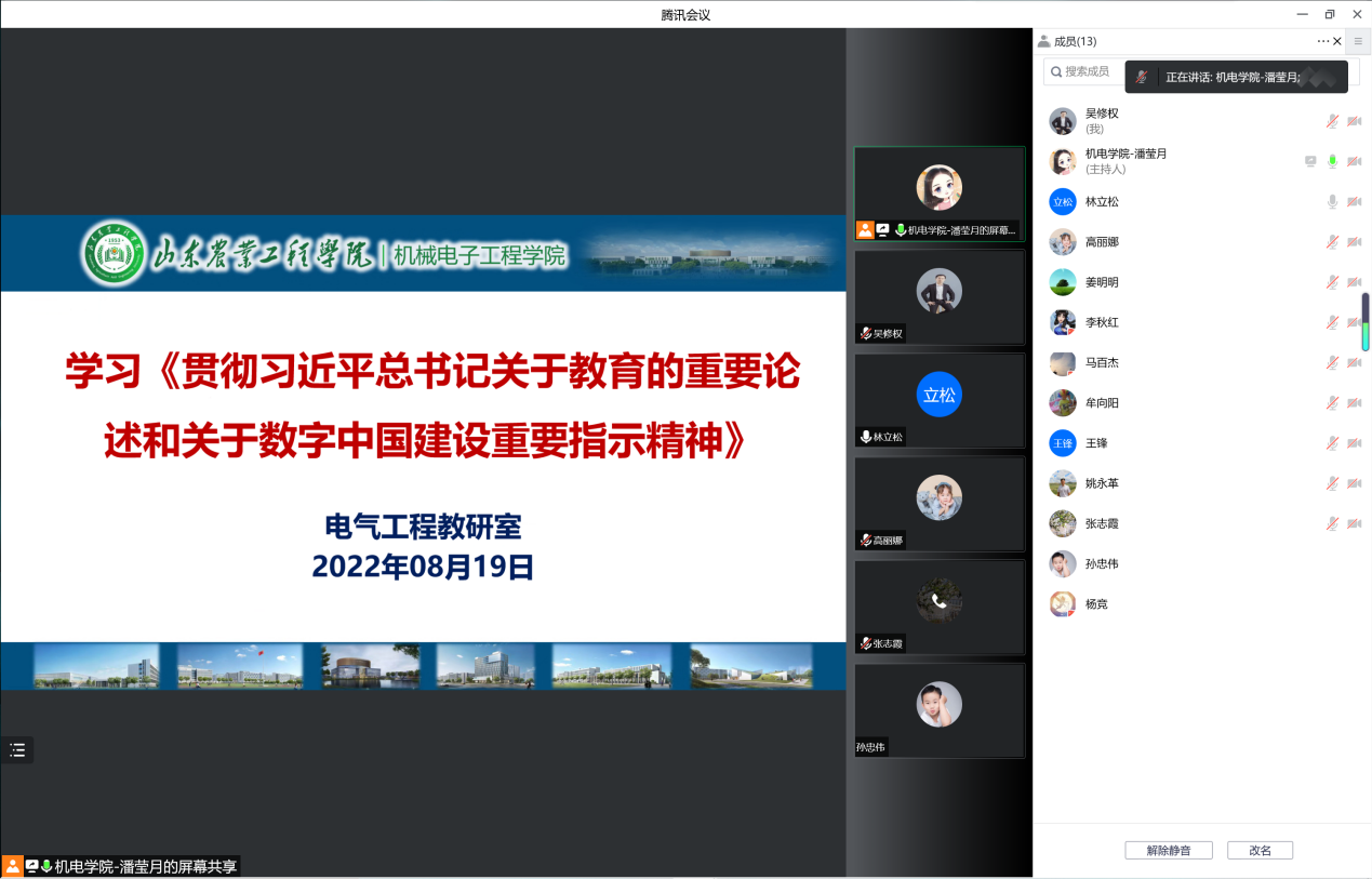 潘莹月带领全体教师集中学习了2017年12月8日习近平总书记在十九届中央政治局第二次集体学习时的讲话精神;2021年10月18日习近平总书记在十九届中央政治局第三十四次集体学习时的讲话精神;2022年7月23日中共中央政治局委员、中宣部部长黄坤明在第五届数字中国建设峰会的讲话;《中华人民共和国国民经济和社会发展第十四个五年规划和2035年远景目标纲要》中对“加快数字化发展建设数字中国”做出的重要部署等内容。会上老师们针对教科研、培育人才等方面与数字中国建设的融合进行了积极的讨论和发言。