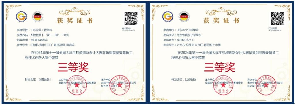 2024年4月19日至21日,第十一届全国大学生机械创新设计大赛慧鱼组竞赛暨慧鱼工程技术创新大赛在杭州电子科技大学圆满落幕,有来自全国221所高校的721个慧鱼创新团队参加竞争。经过激烈角逐,由机械电子工程学院同学设计制作的《绿色智能茄子采摘机》和《AI视觉萝卜“收——装”一体机》两件作品均荣获全国三等奖的好成绩。