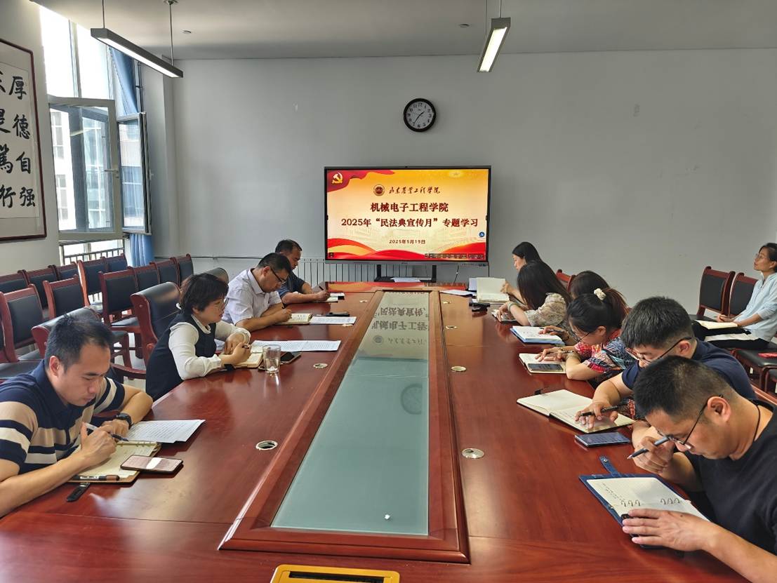 为深入学习贯彻习近平法治思想,进一步提升学院党员教师学法、守法、懂法、用法意识,机械电子工程学院于5月19日在理工东楼B304会议室开展2025年“民法典宣传月”专题学习。会议由机械电子工程学院党总支书记李艳主持,各党支部书记、党总支委员和各教室主任参加。