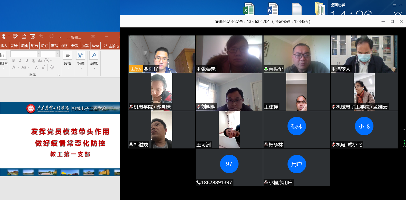 4月24日教工第一党支部全体党员及部分非党员教师以“发挥党员模范带头作用、做好疫情常态化防控”为主题,通过网络议会开展主题党日活动。