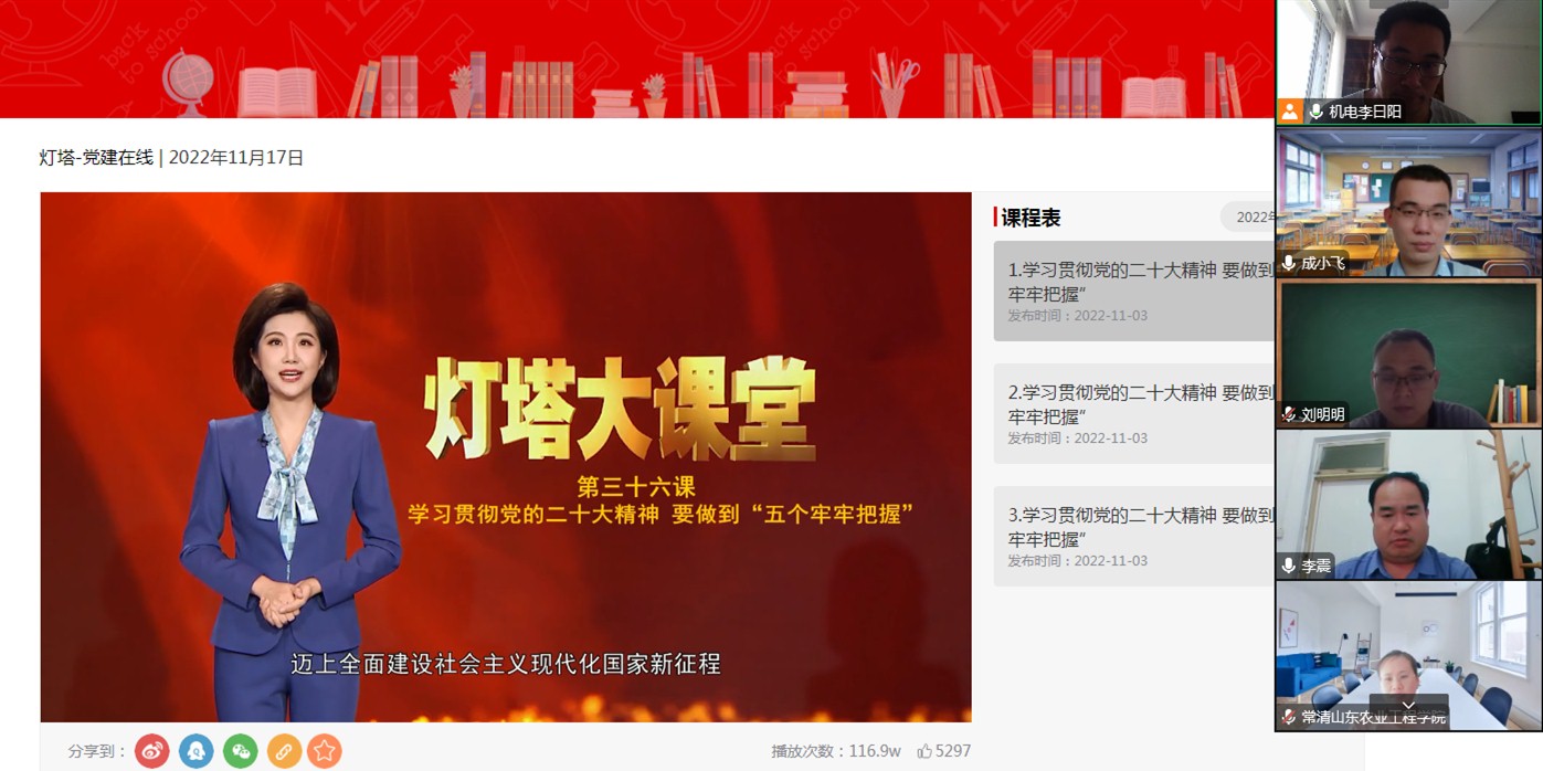 2022年11月17日下午,机械电子工程学院教工第一党支部线上集中学习党的二十大报告,会议由支部书记李曰阳同志主持,支部全体党员参加。
