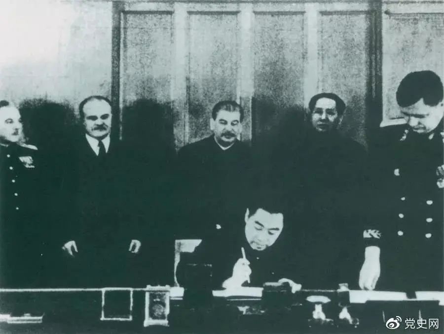 1950年2月14日,毛泽东与斯大林出席在克里姆林宫举行的《中苏友好同盟互助条约》签字仪式。