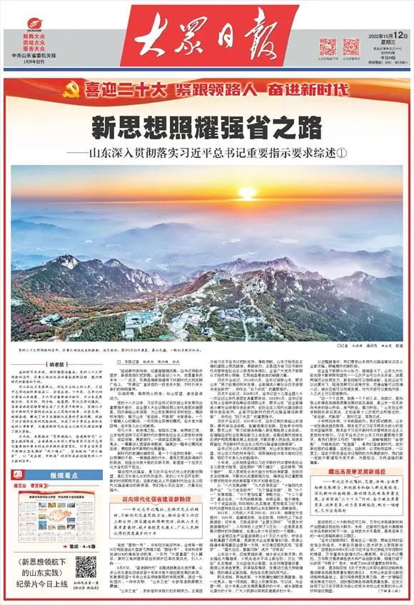 思想的火炬,照耀新时代;坚强的核心,领航新征程。亿万齐鲁儿女将更加紧密地团结在以习近平同志为核心的党中央周围,坚定拥护“两个确立”、坚决做到“两个维护”,牢记嘱托走在前,勇担使命开新局,以优异成绩迎接党的二十大胜利召开。