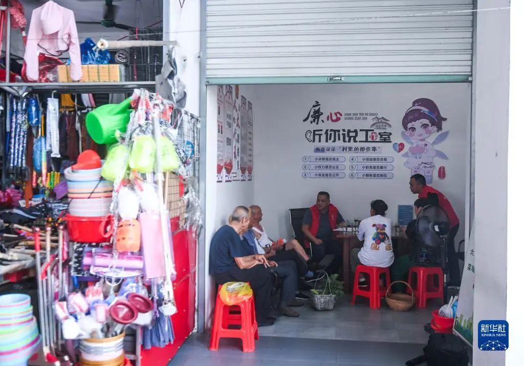 在浙江湖州市长兴县画溪街道姚家桥村菜场的“廉心”工作室内,当地村民反映问题(2022年8月18日摄)。新华社记者 徐昱 摄