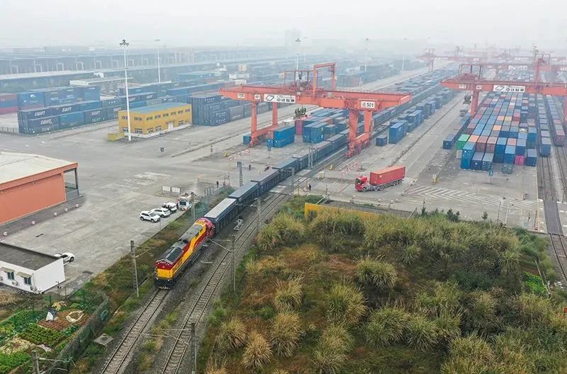 △2023年1月22日,农历新年首趟西部陆海新通道铁海联运班列从重庆团结村中心站发车(无人机照片)。