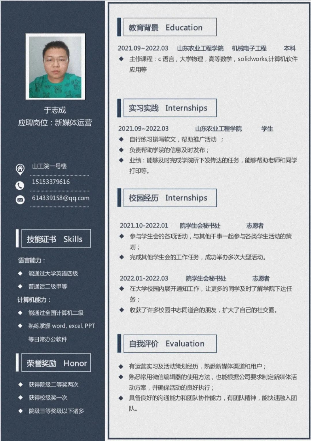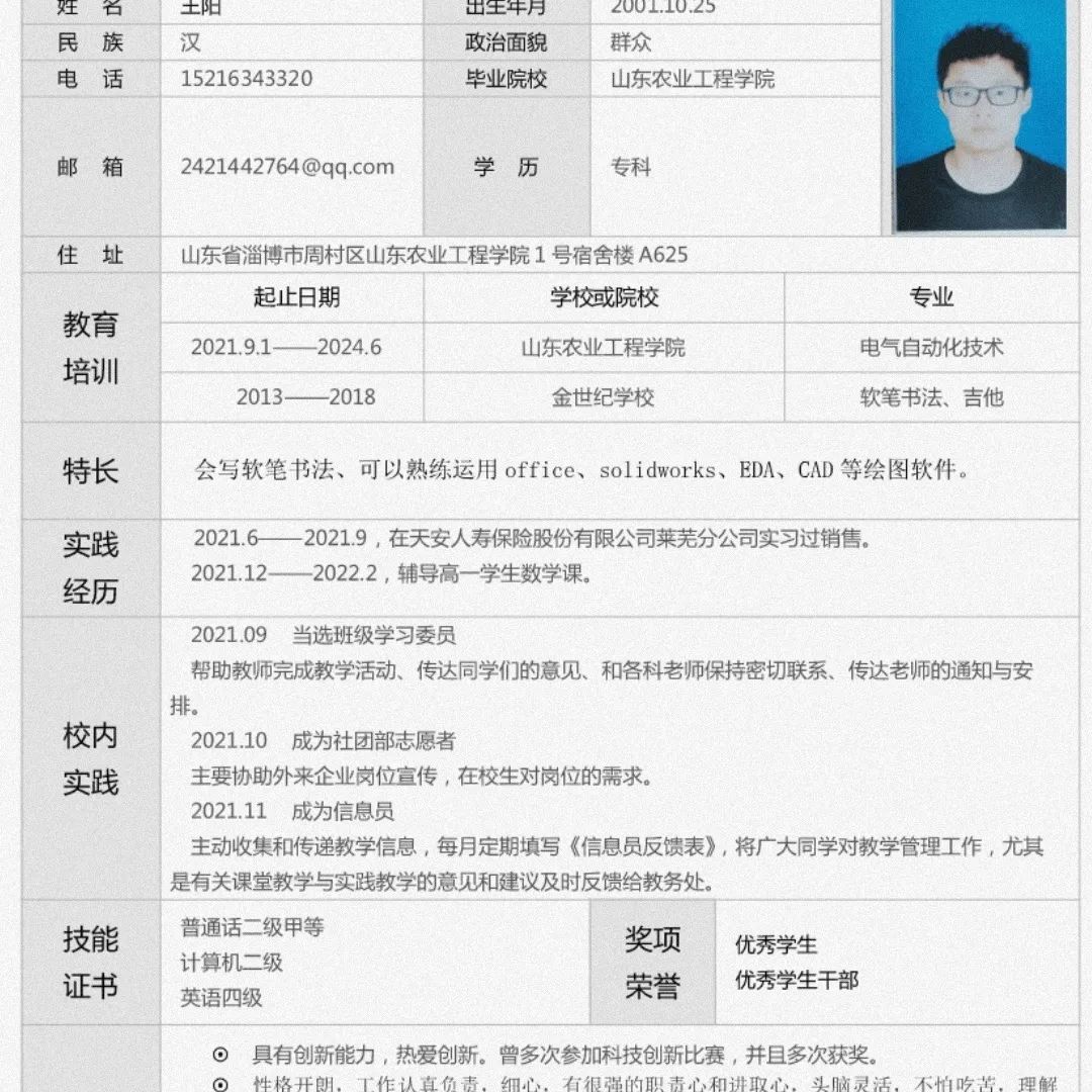最终,经过激烈的角逐,李志豪荣获本次大赛一等奖,李宏业、亓祥玉二等奖,齐凯瑶、王永权、商冬丽获三等奖,滕明宸、闻玲、王阳、于志成获优秀奖。本次简历设计大赛旨在培养大学生职业生涯规划能力和就业技巧,帮助学生挖掘自身潜质,引导学生明确成才方向,以便在求职中有的放矢,更好地推销自己。此次比赛给同学们提供了展示自我、完善自我的平台,提升了大家个人的简历写作水平,增强了同学们就业的主动性,进一步提高了我院学子在求职道路上的竞争力。